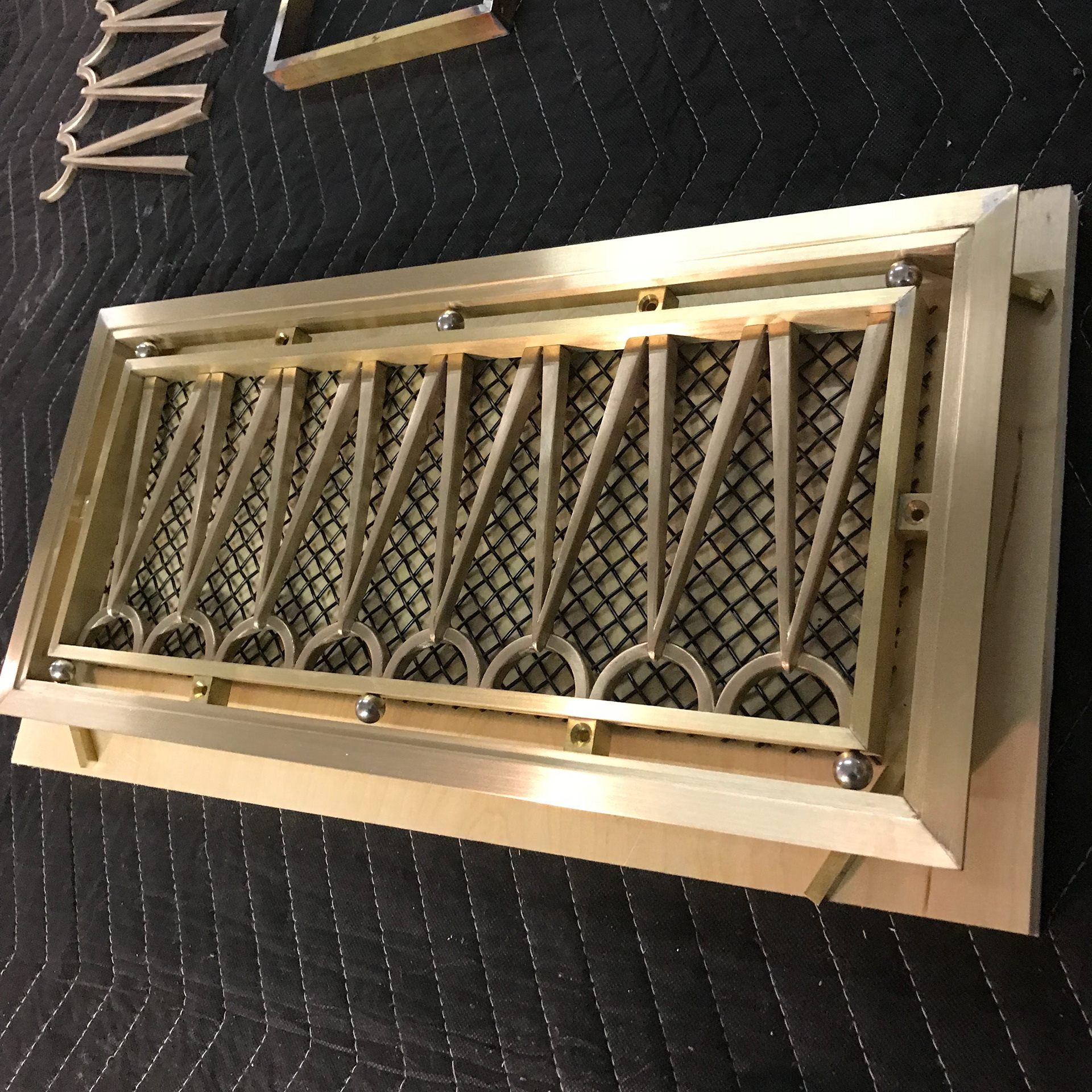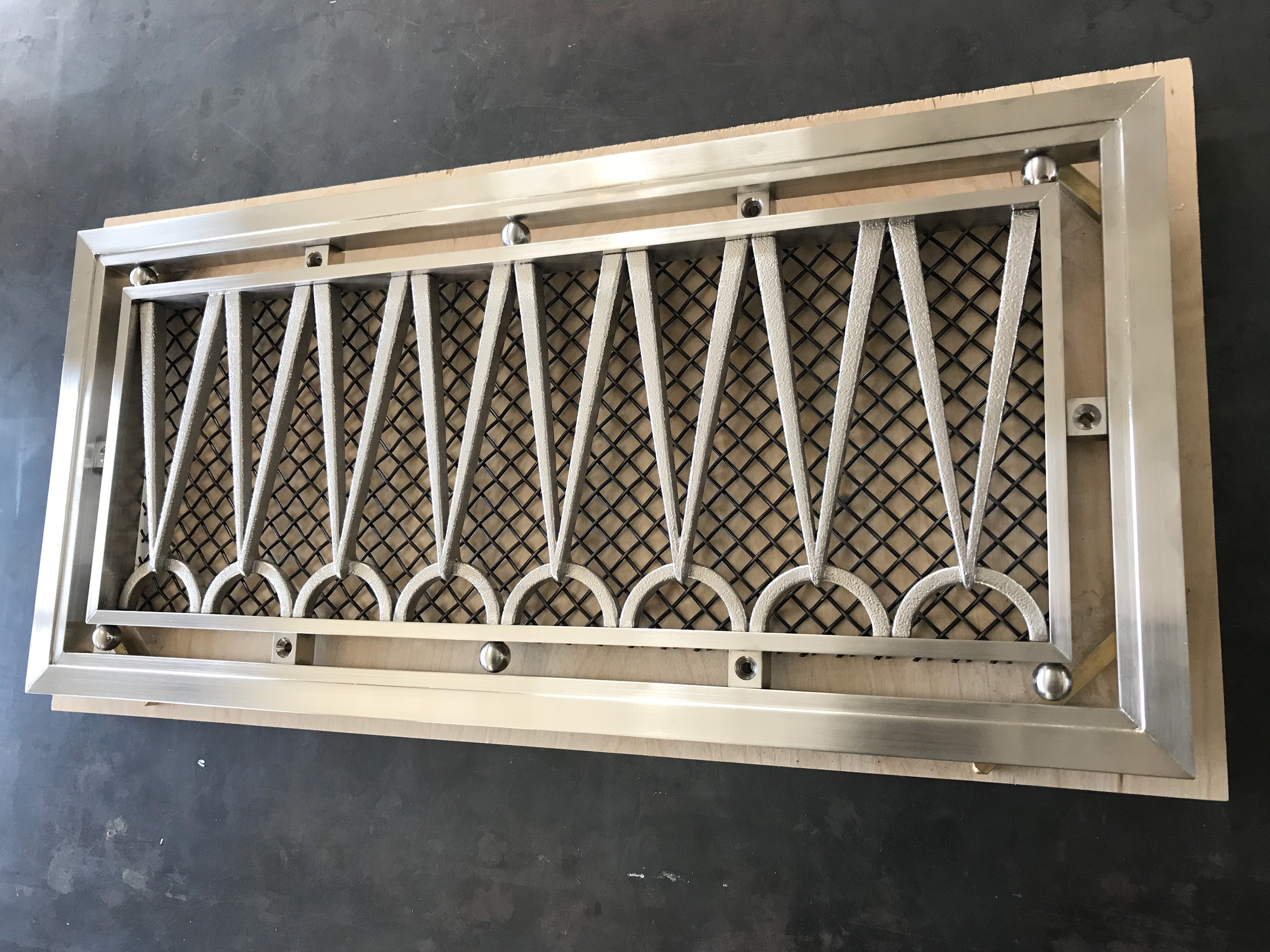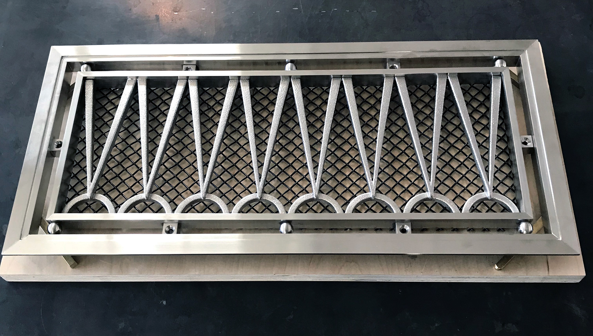 This set of 4 custom grilles were developed and produced at ChiLab Design Studio for Imperial Woodworking Company. Fabricated from brass and bronze, these decorative features are finished in Satin Nickel.