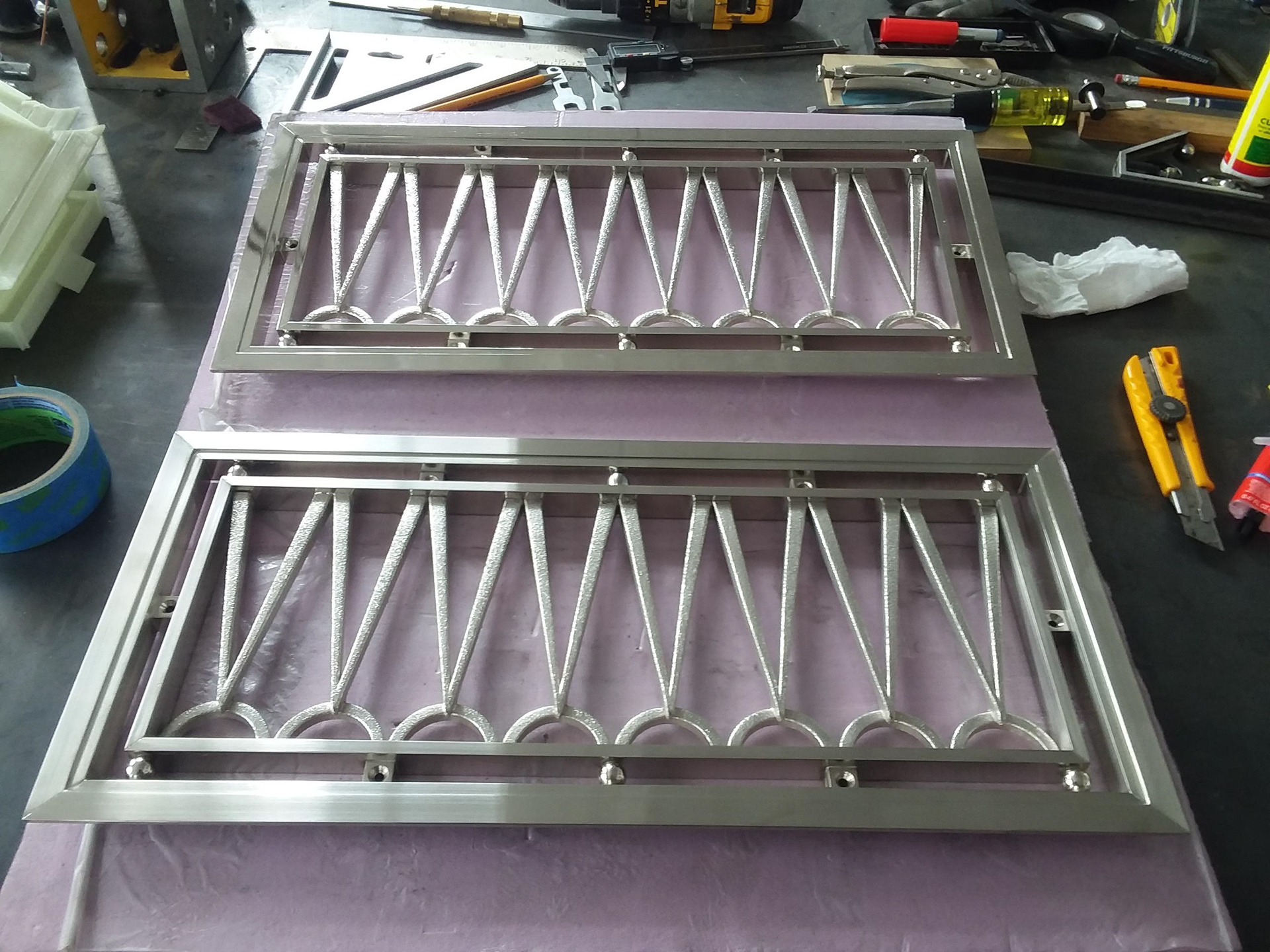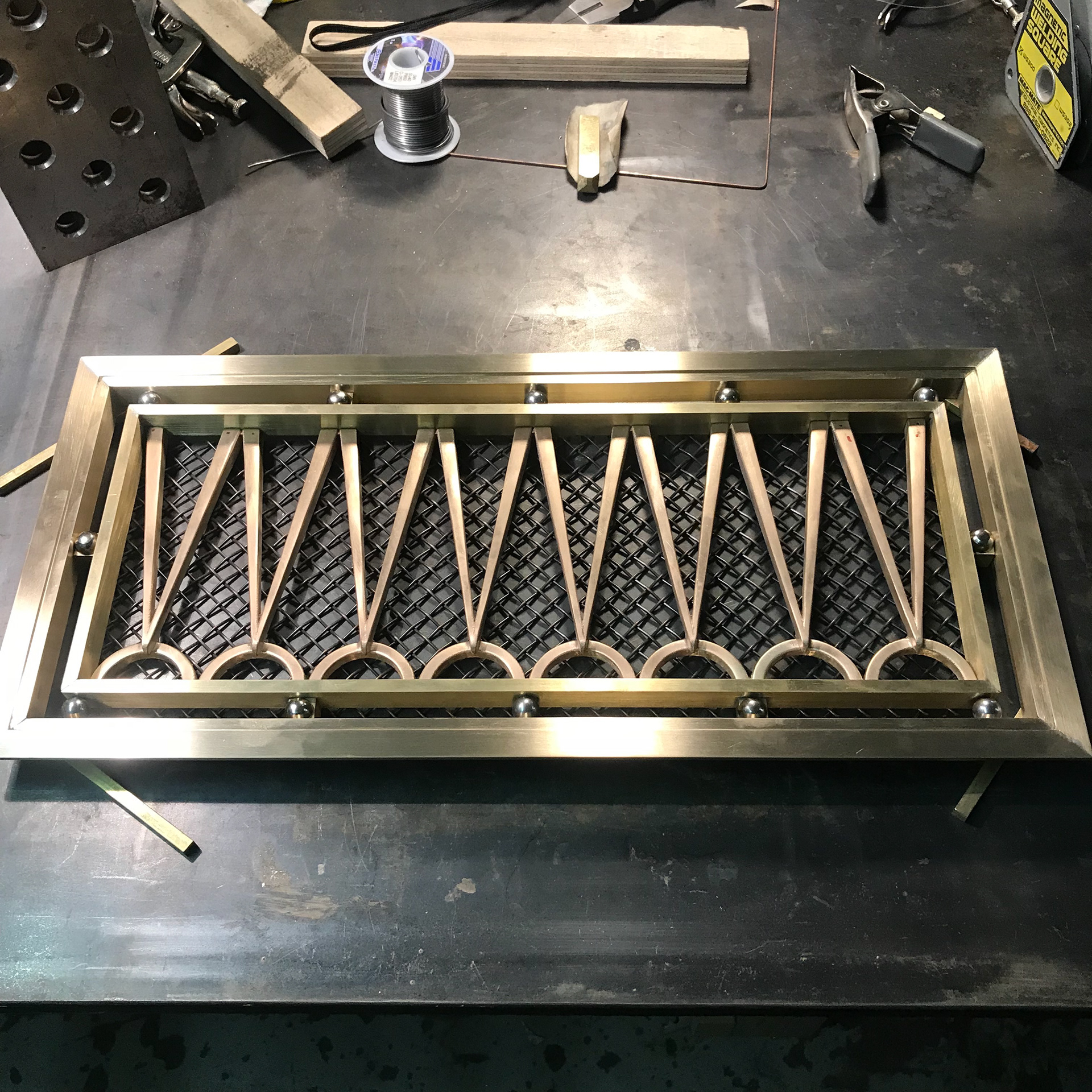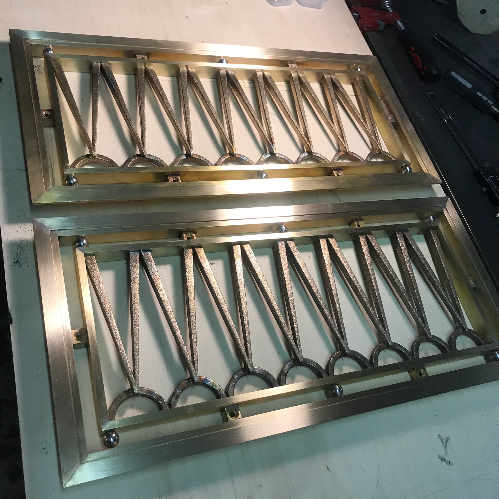 This set of 4 custom grilles were developed and produced at ChiLab Design Studio for Imperial Woodworking Company. Fabricated from brass and bronze, these decorative features are finished in Satin Nickel.
